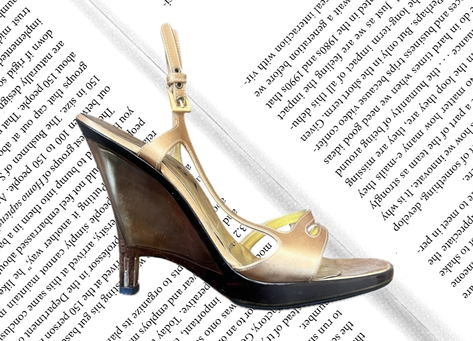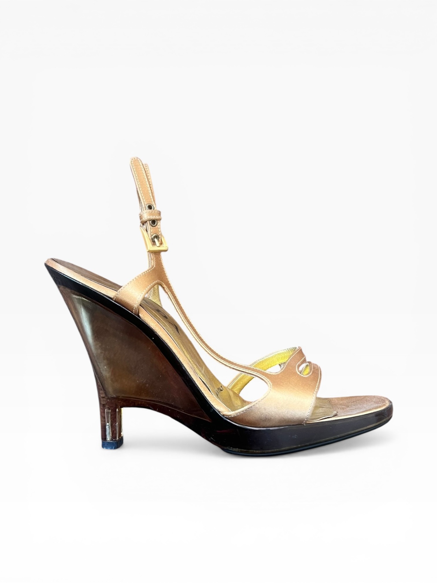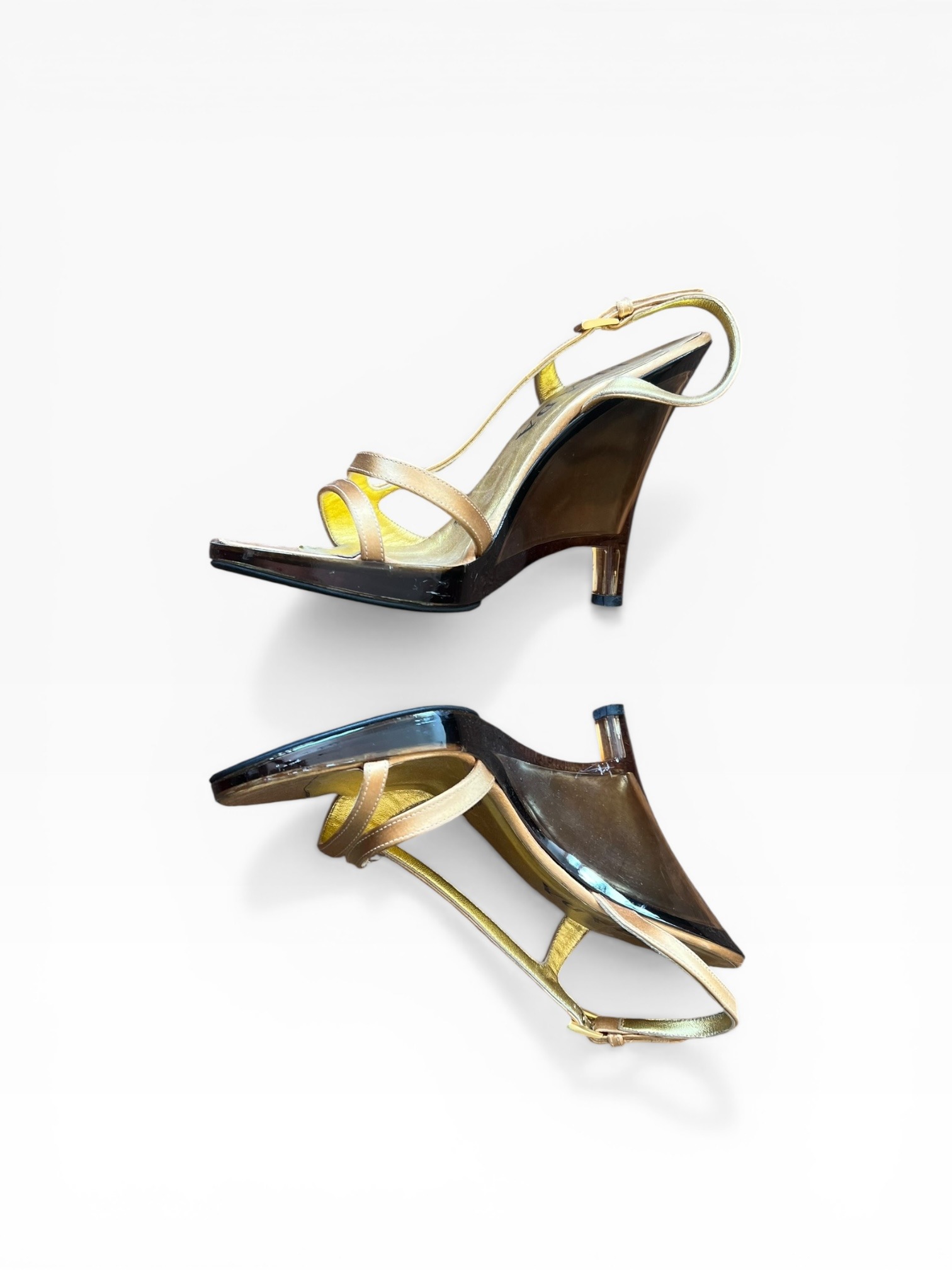 Gold satin and see through PVC around 10cm wedges heel, adjustable strap